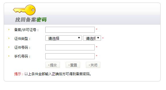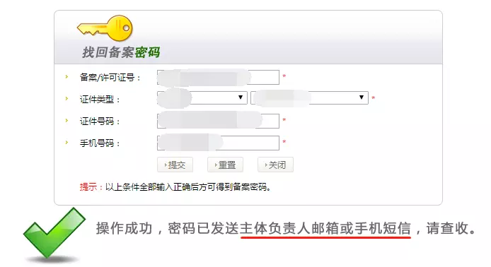 這里提醒填備案時,備案號不-1,-2,證件號一定用原始填寫的號碼,比如早期執照15位應該填原來系統存在證件號,如果你填寫了新的證件號18位將獲取不到密碼。