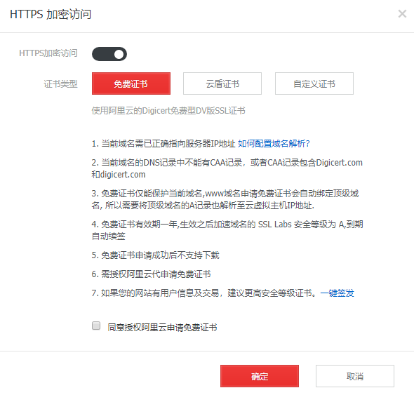 登錄萬網/阿里云cp.aliyun.com主機控制面板-域名管理-添加域名(解析和備案成功的)-再點強制HTTPS加密訪問-開啟-根據提示點確定(如果你的證書在阿里申請的,只管等待安裝結果)