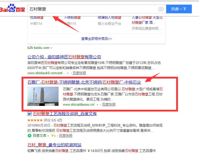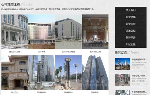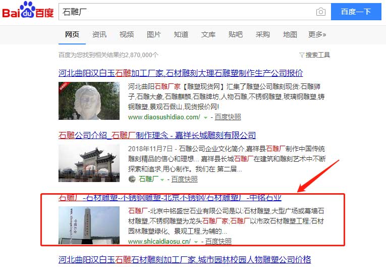 網站優化“石雕廠/石材雕塑/不銹鋼雕塑”網站由環宇網絡重新按優化標準重新制作,并由我司優化該企業產品核心關鍵詞“石雕廠/石材雕塑/不銹鋼雕塑”排名已經達標搜索引擎首頁,助力企業“北京中銘盛世石業有限公司”互聯網發展...