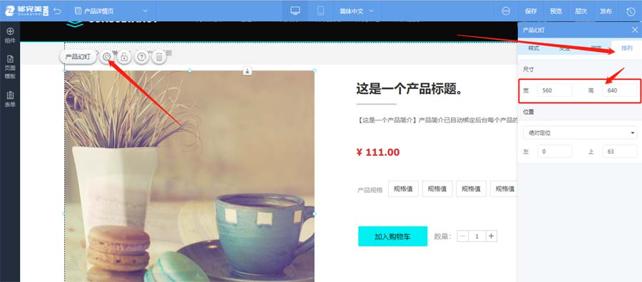 進(jìn)入網(wǎng)站設(shè)計(jì)-產(chǎn)品詳情頁(yè)-點(diǎn)擊圖片幻燈片設(shè)置-再點(diǎn)排列,在這里可以設(shè)置幻燈片組件的大小。這里我們輸入寬560,高640;