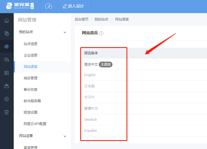 699元網站建設全能版支持的六種語言分別是:Español 西班牙語(簡稱西語)/Deutsch 德國/한국어 韓國/日本語/English 英文/中文簡體/中文繁體...