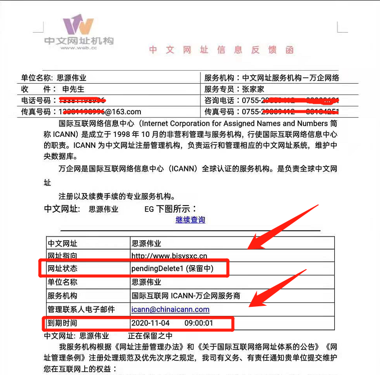 以中文網址到期保留為由,用中文網址機構發反饋函,這種情況已經不少見了,但